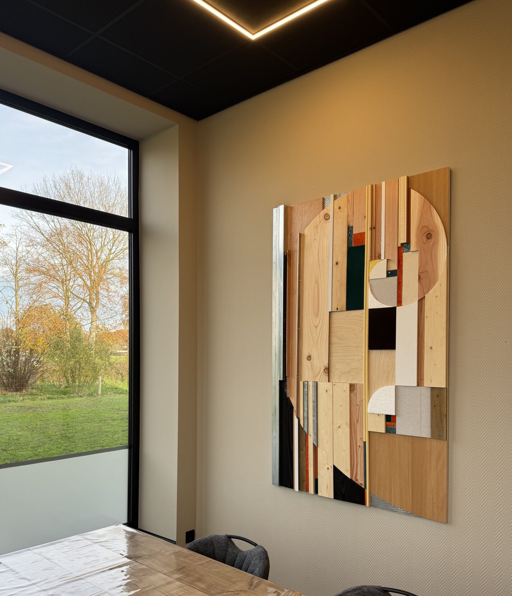 Ik heb ervoor gekozen om een compositie te maken met de materialen waar zij dagelijks mee werken. Naast metalstud profielen, gips, plafondplaat en hout zijn vele (bouw)materialen onderdeel geworden van het geheel. Daarnaast heb ik speciale keramiek tegels gebakken en bewerkt en die geven het geheel een frisse uitstraling.